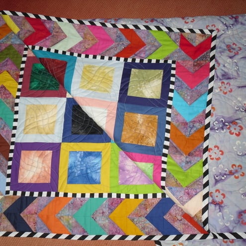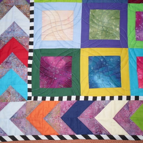 Using a charm pack of fossil fern fabric, I designed and created this quilt, utilising a variety of plain fabrics to complete the blocks. A border constructed using the flying geese block was added to complete the quilt top. A 100% cotton batik fabric is used to back the quilt, and I have used premium heirloom cotton batting. The all over curved quilting design is completed on the sewing machine.The quilt measures 58" wide by 83" long, and is suitable for a single bed.