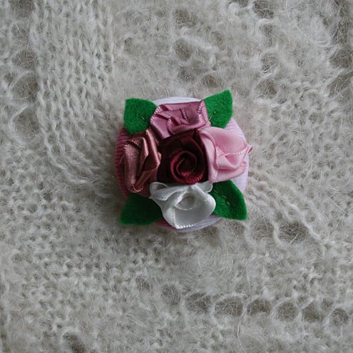 A circle of plastic, from a recycled bottle, is gently padded and covered with recycled knitted fabric. Pink ribbon roses, in five coordinating shades of pink and white, nestle at the centre of the brooch. The design is completed with felt leaves.