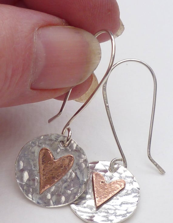 Dangling copper hearts on a silver disc. Hand sawn copper hearts soldered on to a hammer textured sterling silver disc hang from long elegant silver earwires. Each pair is hand cut so there will be slight variations. I f you would like short / regular earwires please let me know at checkout.