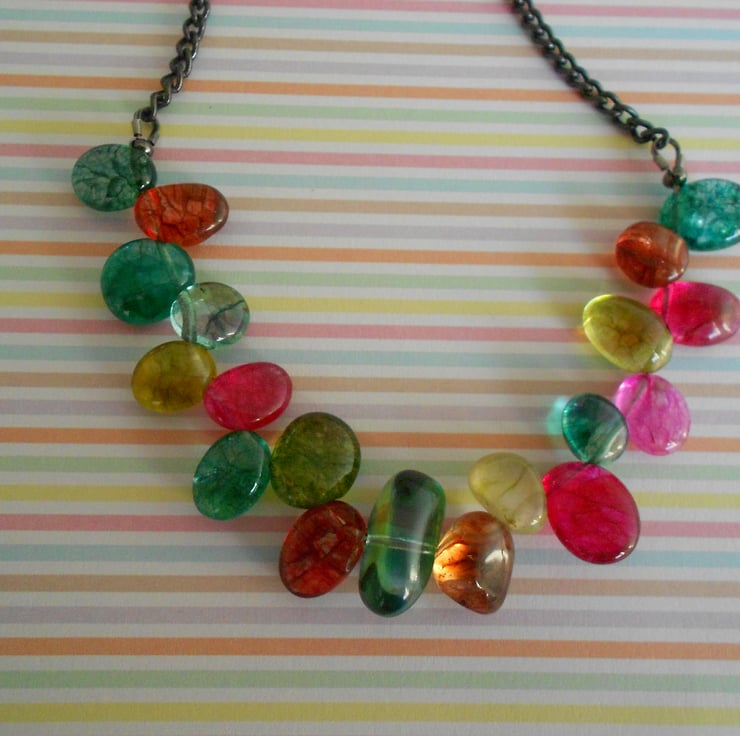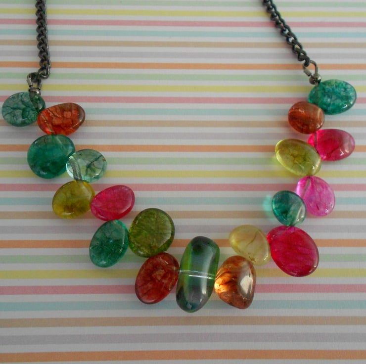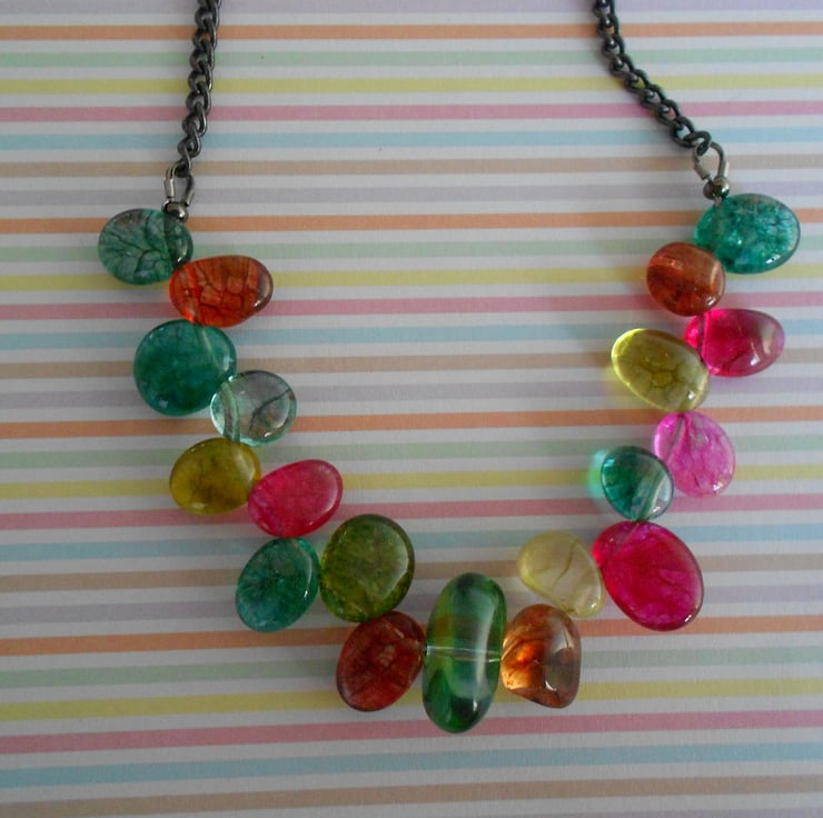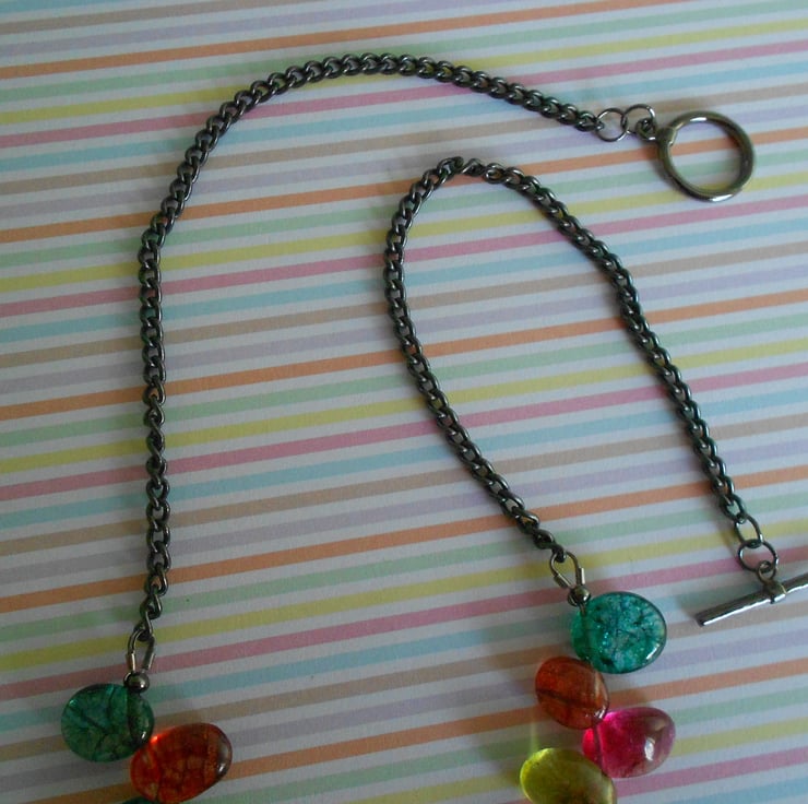 This is a lovely necklace made from top drilled quartz drops which are vibrant multi colours. The upper body of the necklace is black chain finished with a black toggle clasp, it measures 46cm (18"). As all of the items in my shop are individual pieces this is the necklace you will receive. It will arrive gift wrapped in tissue paper and an organza bag.