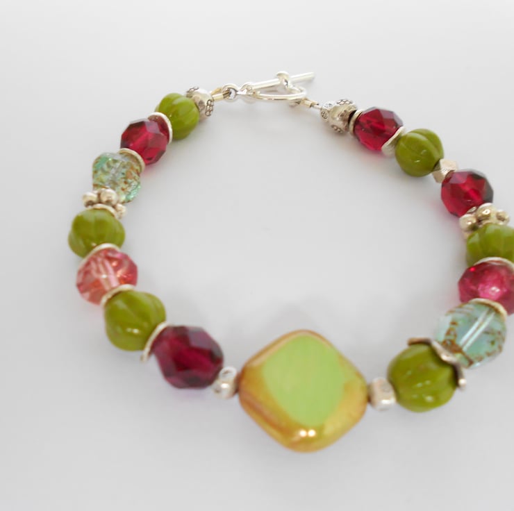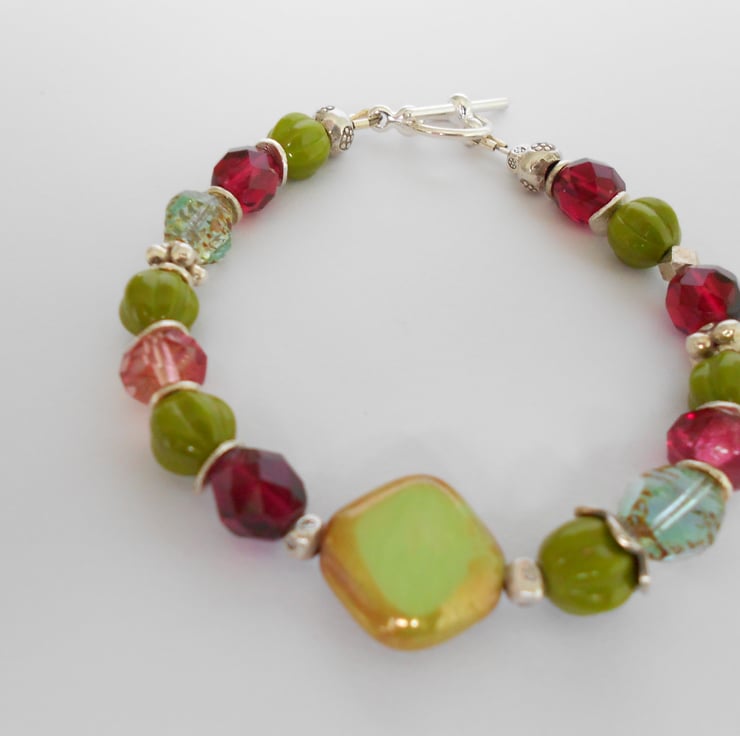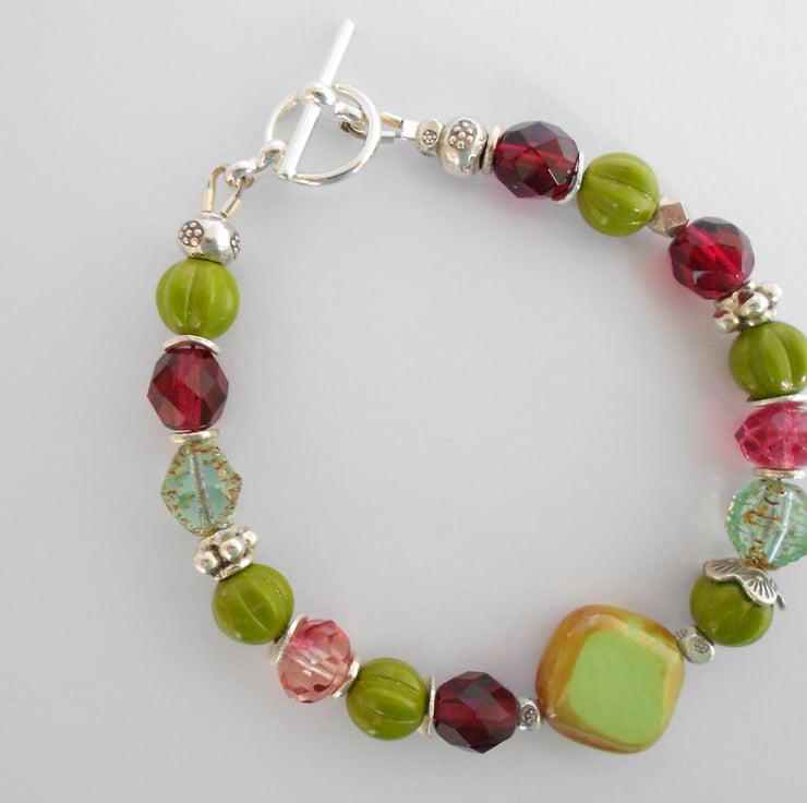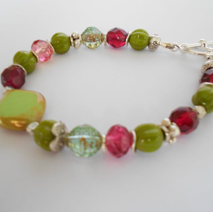 This is a lovely bracelet made from high quality czech glass beads and hilltribe silver. Hilltribe silver is purer than sterling silver which makes it softer and easier to shape and carve. The czech glass beads consist of preciosa crystals, glass melon beads and a lime picasso bead with gold lustre at the focal point. The lime and olive colours blend well with the raspberry and pink crystals. The hilltribe silver beads are of various shapes, including round washers, flower rondells, fancy bead caps and printed round beads. As all of the items in my shop are i ndividual pieces this is the bracelet you will receive. It will arrive gift wrapped in tissue paper and an organza bag.