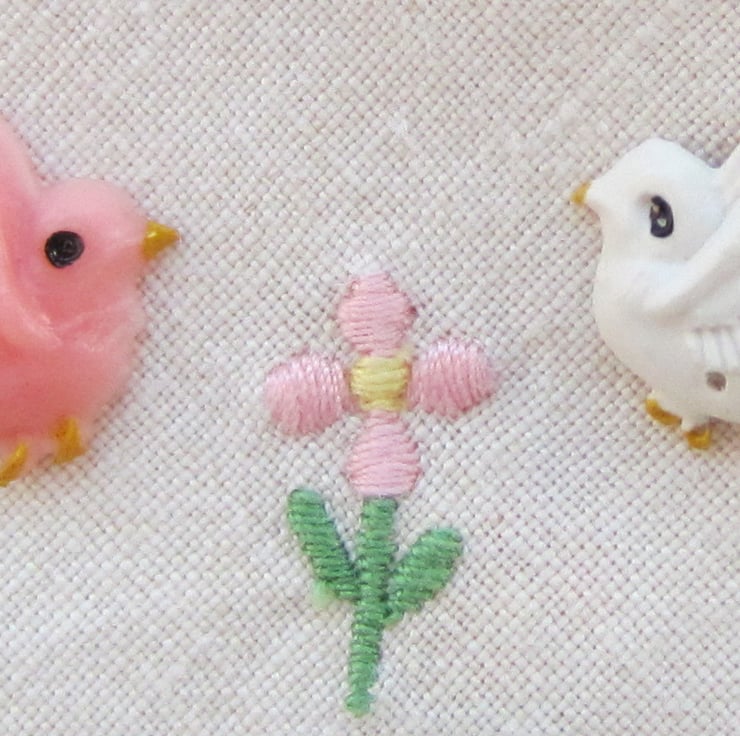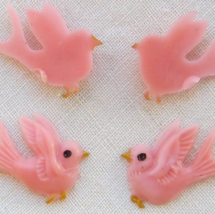 8 little plastic vintage buttons; 4 pink and 4 white. Please note the pink birds don't actually have holes, but could probably be done (but not by me!). Not sure of age, but I'm guessing about the 1950's. Each bird measures about 24 x 30 mm.