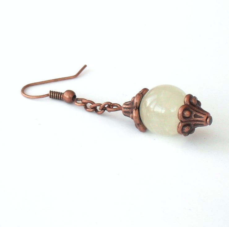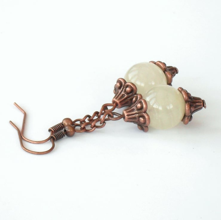 The result is a unique, one-of-a-kind pair of earrings. The agates are beautiful, and are milky white, almost buttermilk in colour. The copper coloured beadcaps provide an ideal frame to the gemstones.