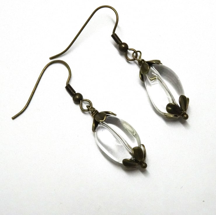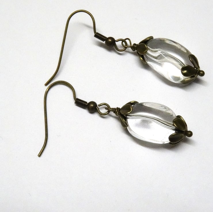 These are lovely rock crystal nuggets which are very clear, they are finished with antique brass bead caps and hanging from nickel free earwires. The earrings measure 4cm (1.1/2") from top of earwire. As all of the jewellery in my shop is handmade by me, these are the earrings you will receive. They will arrive gift wrapped in tissue paper and a organza bag.