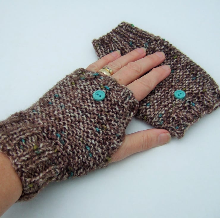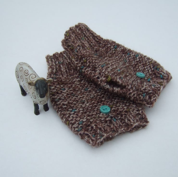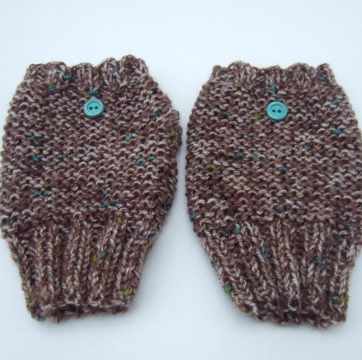 Hand knit fingerless gloves with a vintage turquoise button decoration.