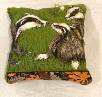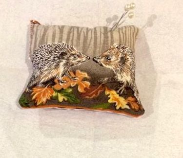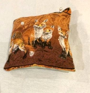 Pretty little handmade padded wildlife patterned cotton square pincushion. Underside in a plain suede like material, cushion comes with a couple of pins. Four available, let us know which you would like. Machine washable.