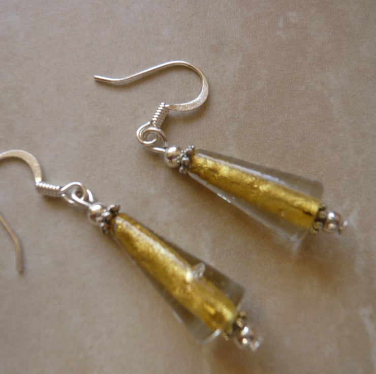 These gold lined beads are finished off with two spacer beads and hang from a silver plated ear wire. I will include rubber stoppers with these.