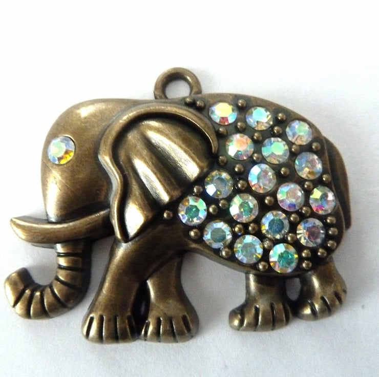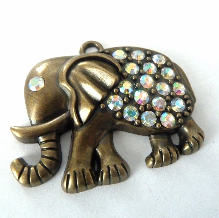 A bronze plated elephant pendant which features sparkly gems.