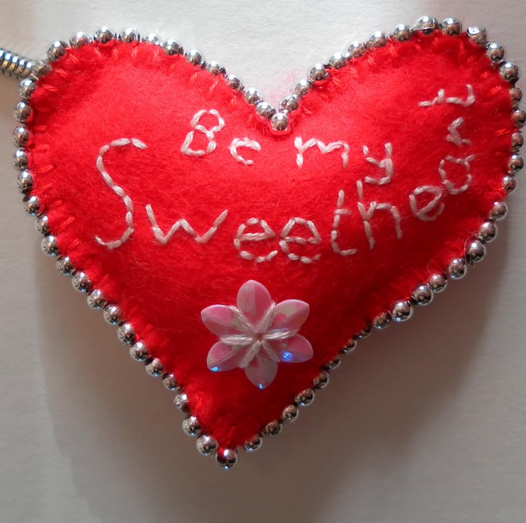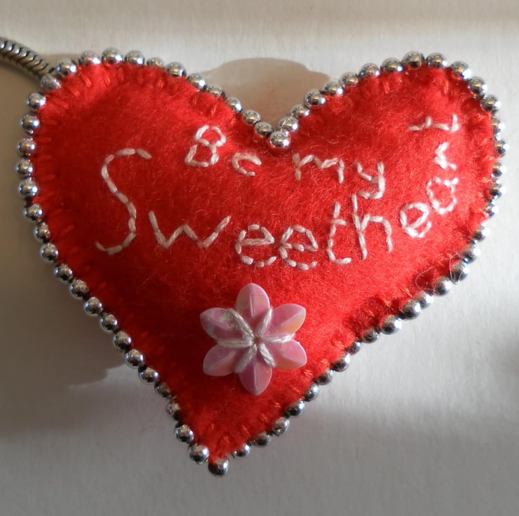 Ideal Valentine's Day gift, sweet, red felt heart keyring. This unique heart is hand embroidered with “Be My Sweetheart” and decorated with silver beads and a pink flower sequin. It measures 6cm x 5cm approximately, is lightly padded and has a keyring chain sewn to the back.
