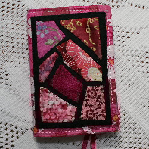 A 'stained glass' design, in shades of bright pink, has been applied to the front of this cover containing a pad of self-adhesive notes. The design is created by the needle-turned hand applique of small scraps of fabric onto a black felt background. This technique ensures that all raw edges are tucked safely under each applied piece.