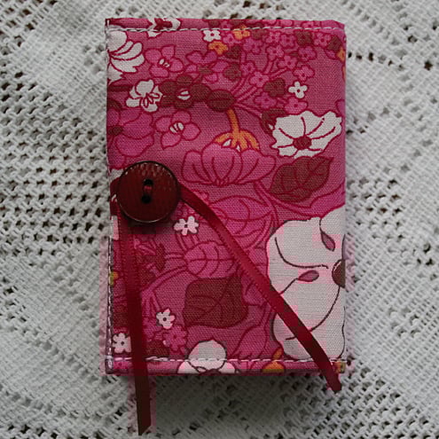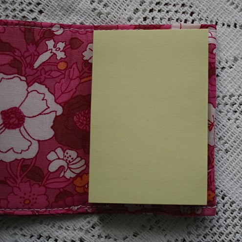The note pad cover is made from a vintage fabric in a bright pink, floral design and closes with matching ribbons wound round a coordinating button. The cover is stiffened with two layers of interfacing. A pocket inside the back of the cover contains a small sheet of re-cycled plastic. The pad of notes is retained in the cover by removing the backing sheet from the bottom note and using its own self-adhesive strip to attach the pad to the plastic.