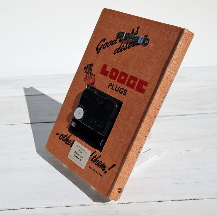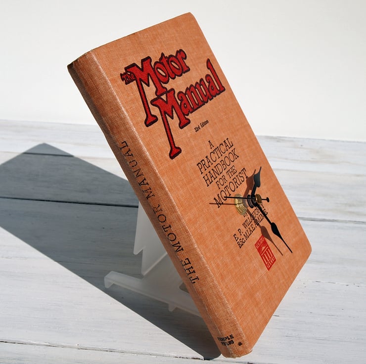 This stylish book clock is made by repurposing a vintage hardback edition of The Motor Manual, 33rd edition 1948.