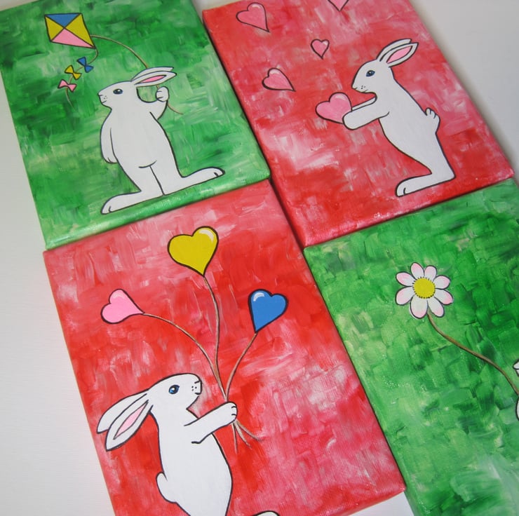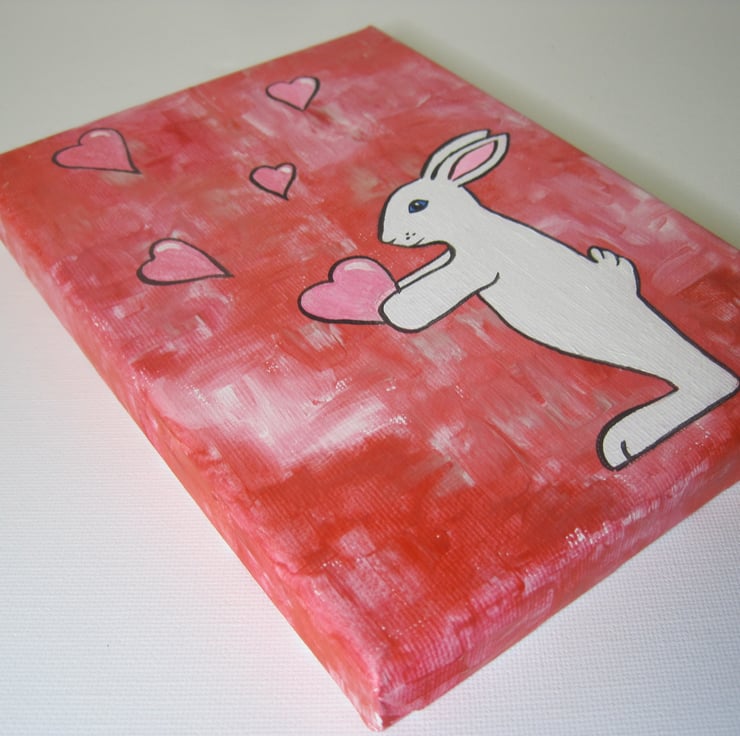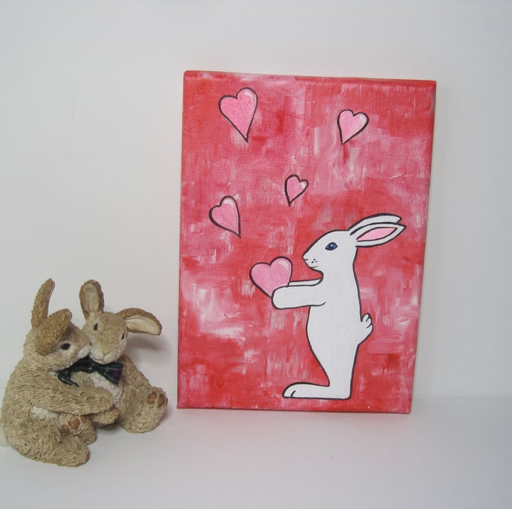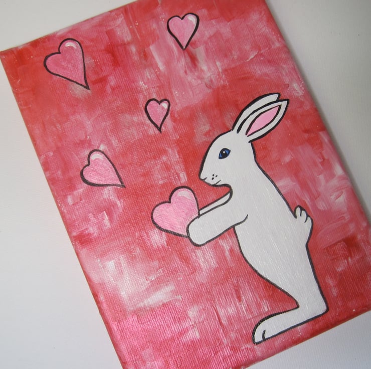 This is an original acrylic painting of Blue Eyed Bunny with love hearts. Painted in a sweet simplistic style this would appeal to adults or children. Part of my 'Blue Eyed Bunny' range.