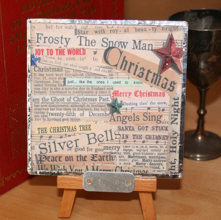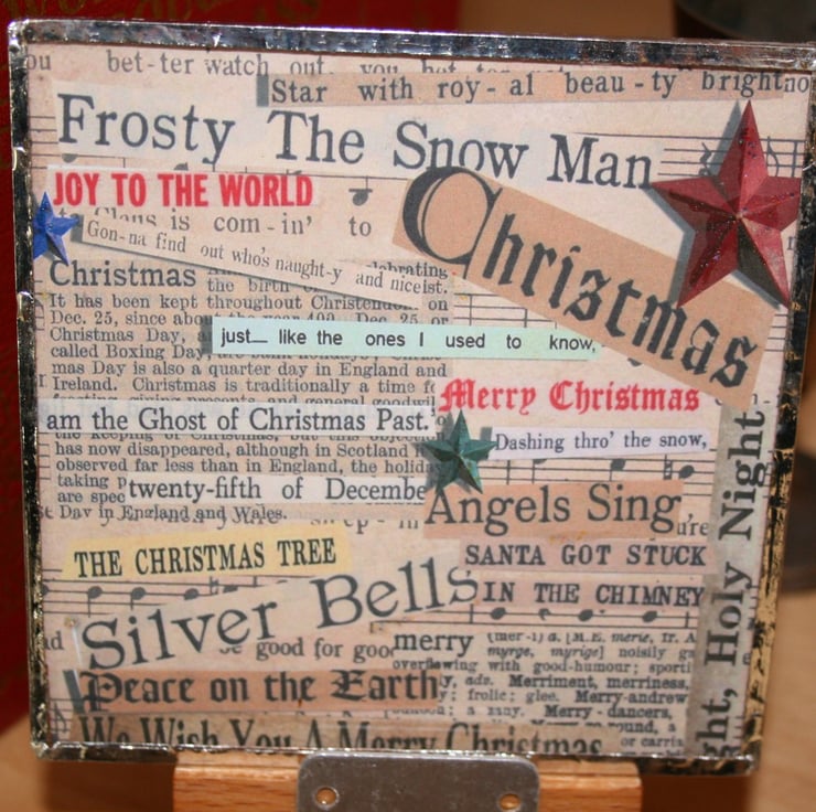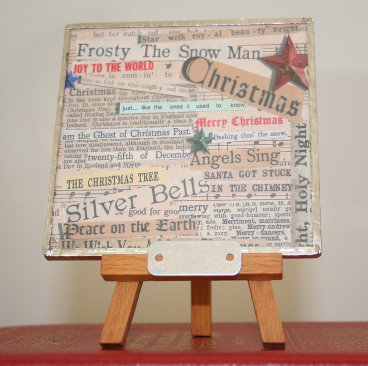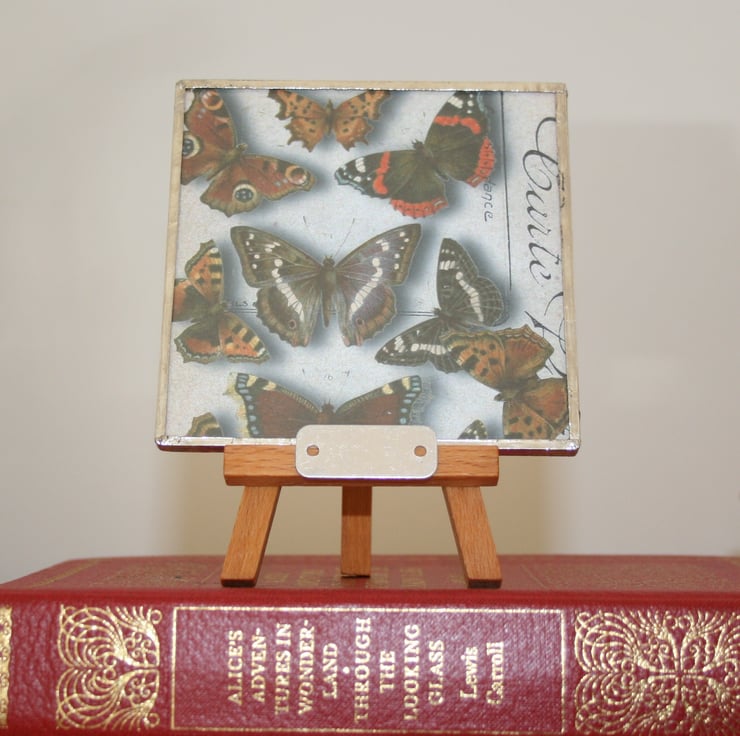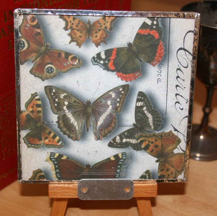 I had some mini wooden easels stands and some pieces of glass(approx 10x10cm), so I thought, great, I can make pictures and display them on the easel. Then I had another idea, I can make them double sided instead of leaving the back blank.