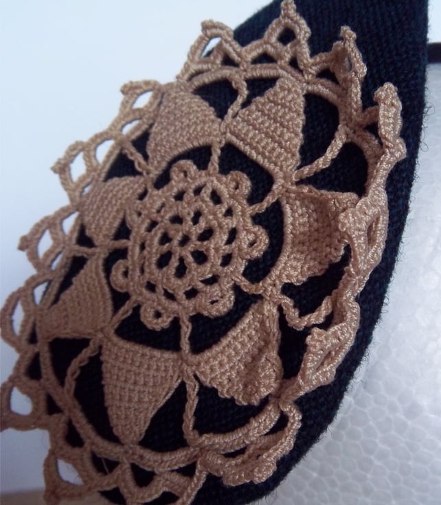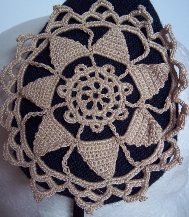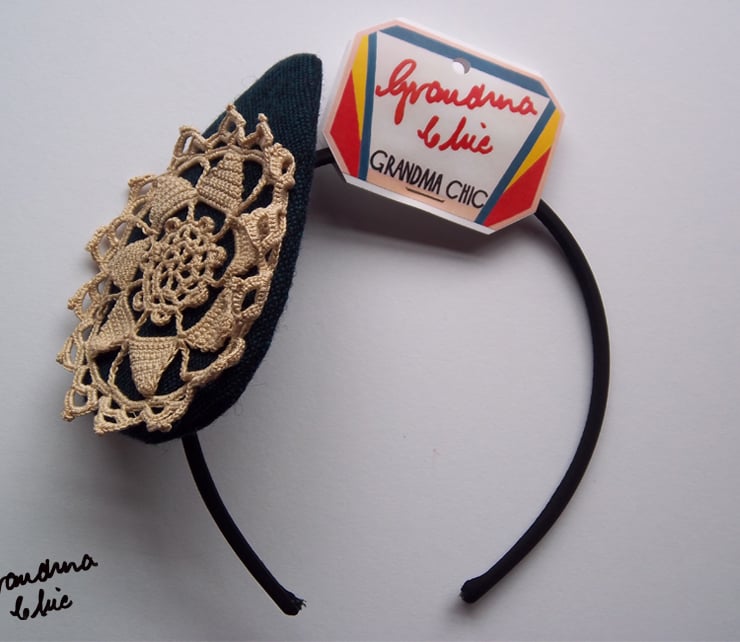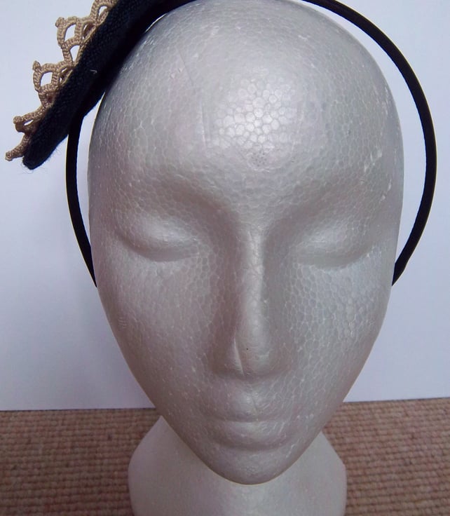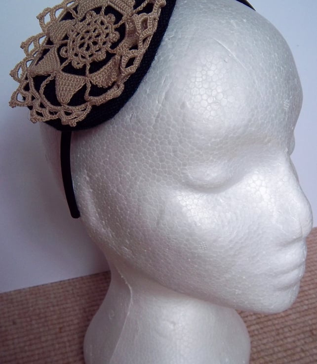 Handmade fascinator with appliqued vintage crochet motif on a woolen base. Perfect for weddings and parties. Standard size Alice band. Any questions, please ask.