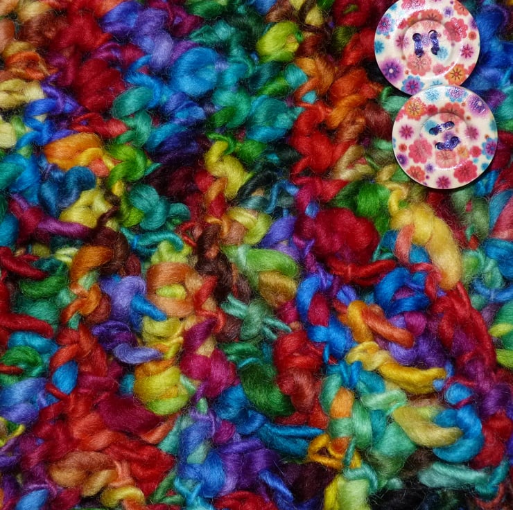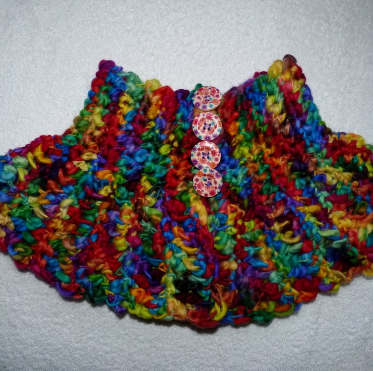 I thought the rainbow colours of this gorgeous slub yarn would make a lovely scarf for winter, but as I only had a small quantity of wool, I ended up creating a cowl instead!
