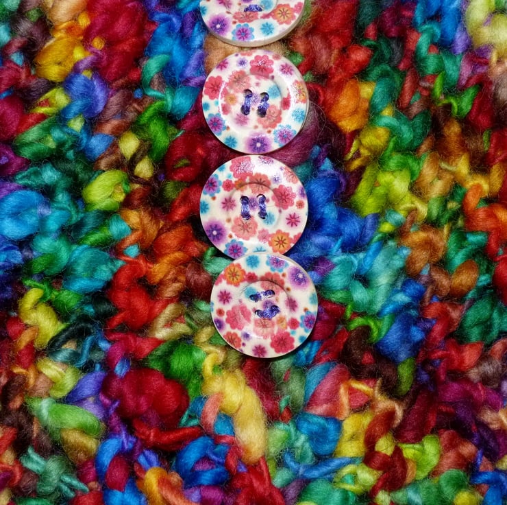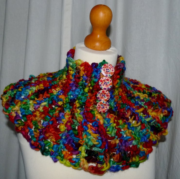 The cowl lies beautifully around the shoulders, and has a tall neck section, with 4 wooden buttons and crochet button loops..