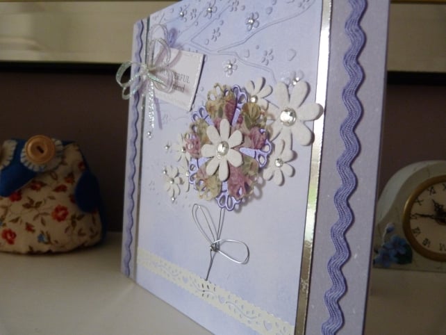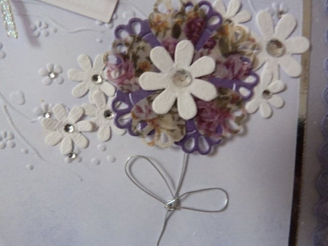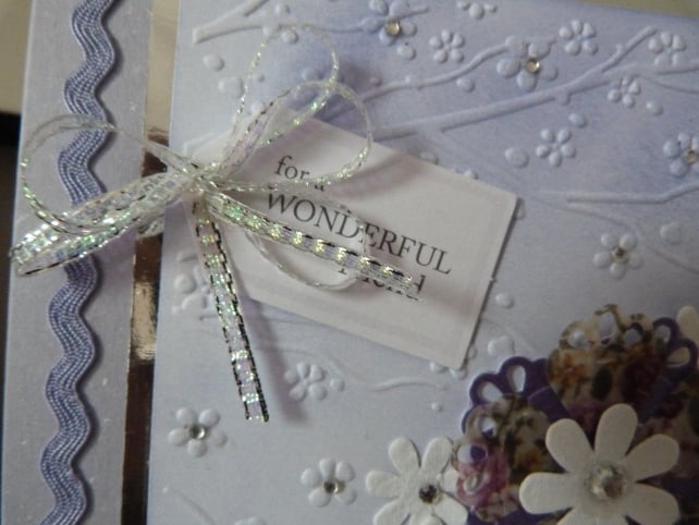 A pretty flower die cut from flower patterned vellum and puple pearl card. The stem and leaves made from silver wire. Mounted onto quality white card which has been distressed in lavender blue and embossed with pretty cherry blossom branch. Mounted onto slver mirri card and then onto grey/white flecked card. Edges finished off with lilc ric rac ribbon. For a wonderful friend tag with silver ribbon bow. The flowers embellished with crystal rhinestones.