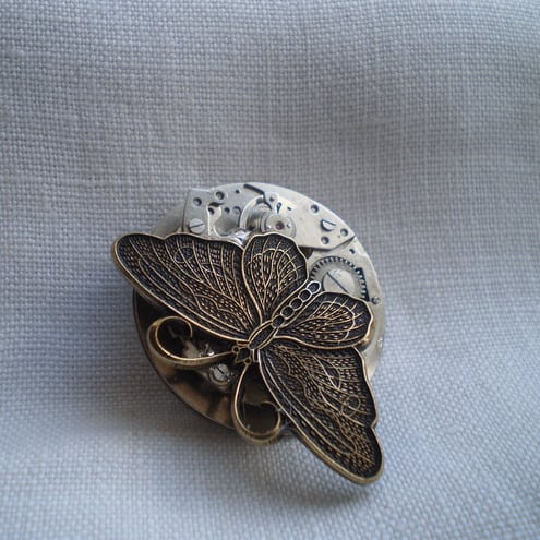 A delicate butterfly with detailed etched wings has landed on a Vintage pocket watch movement. A very simple and stylish brooch with a difference. For the lovers of vintage and the unusual. Measures 3 cms in dia.