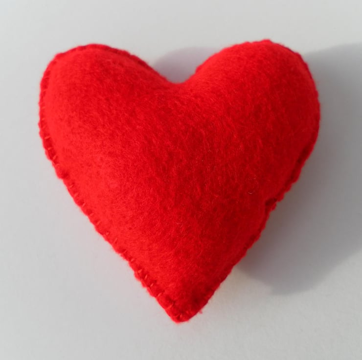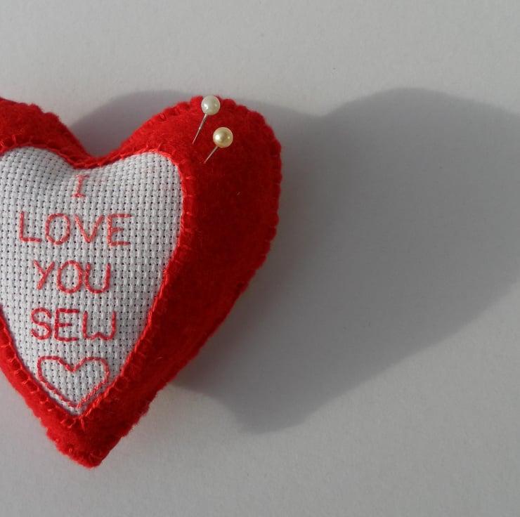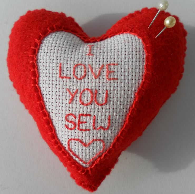 This beautiful and unique, hand sewn, red felt heart, pin cushion is an ideal gift for your Valentine who sews. Hand embroidered backstitch, in graduated pink to red, on a panel of white Aida are the words “I LOVE YOU SEW”. The heart is tightly packed with padding and measures approximately 8cm x 8cm. There is a matching scissor case in my shop.