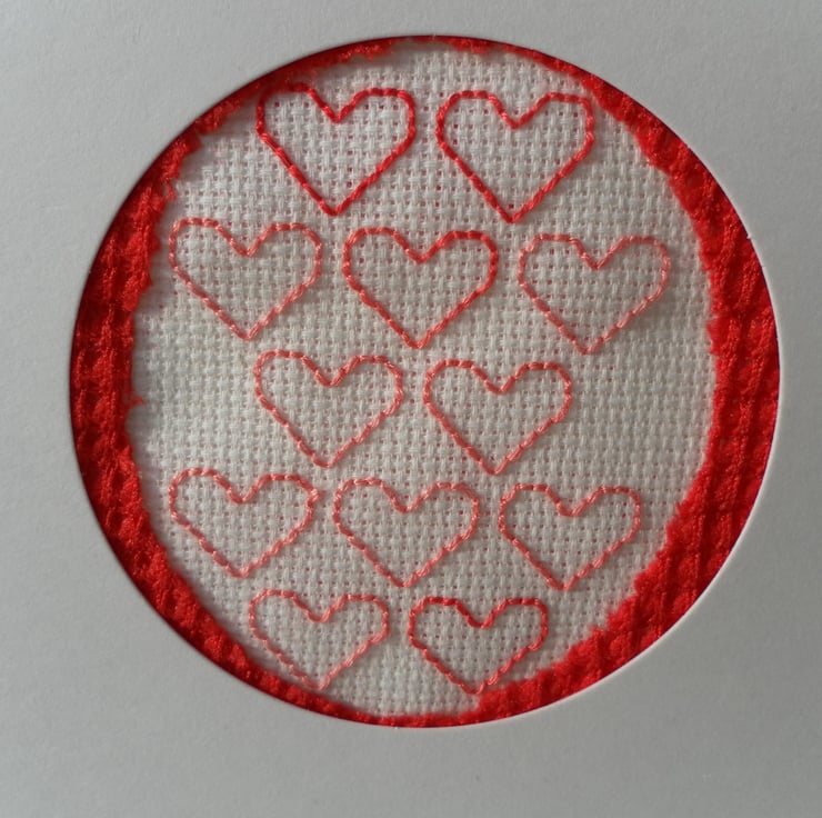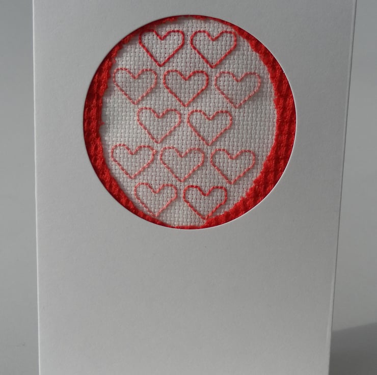 Beautiful, unique card, twelve, hand embroidered red and pink hearts on white Aida fabric with a red fabric border. Card measures approximately 10cm x 15cm and is blank inside for your own message.