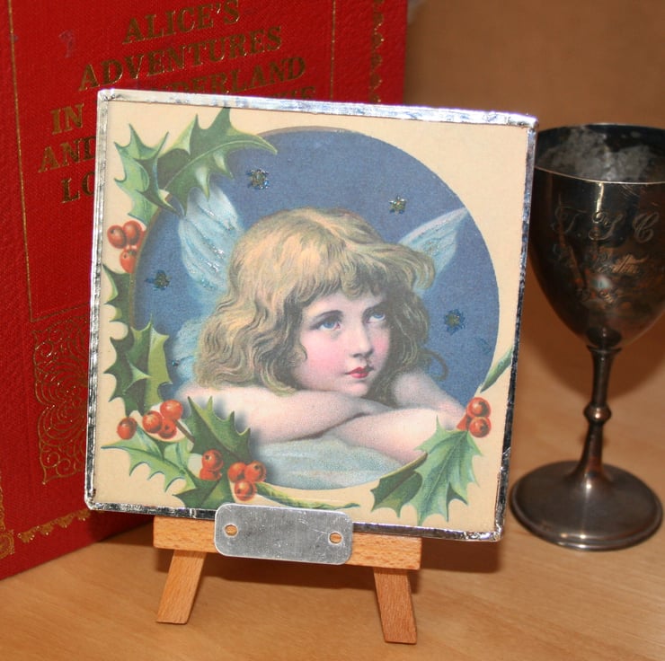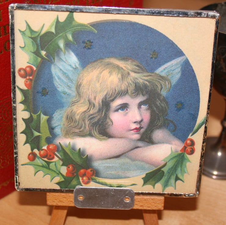 When Christmas comes flip the glass piece over and you have an ideal Christmas image of a little angel in a frame of holly.