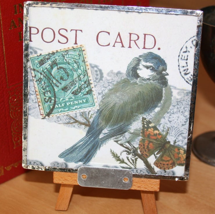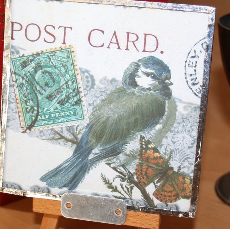 I had some mini wooden easels stands and some pieces of glass(approx 10x10cm), so I thought, great, I can make pictures and display them on the easel. Then I had another idea, I can make them double sided instead of leaving the back blank.