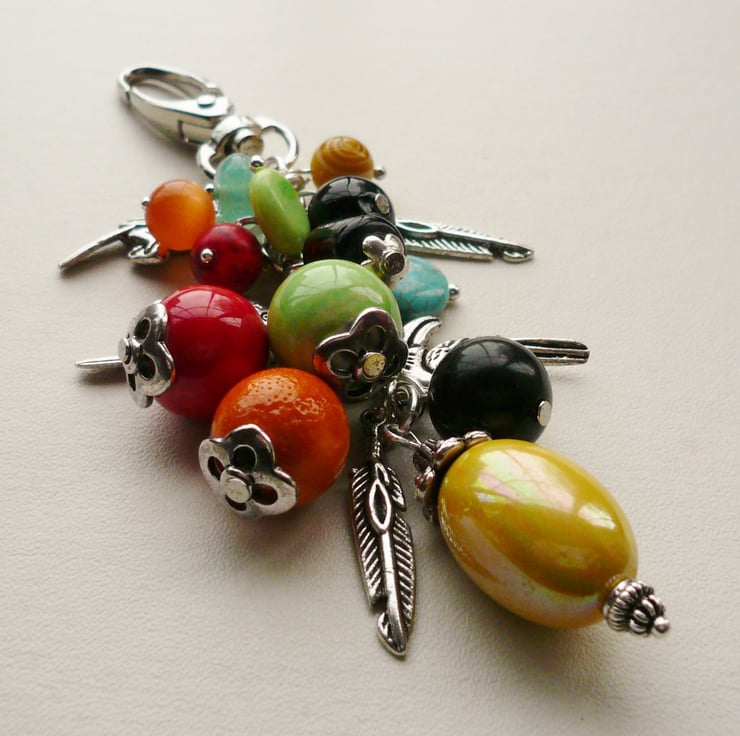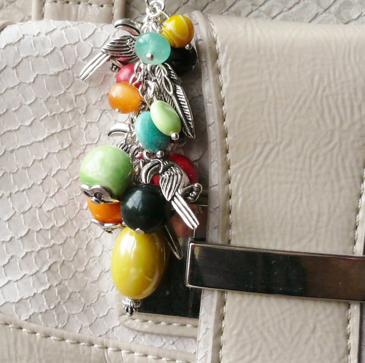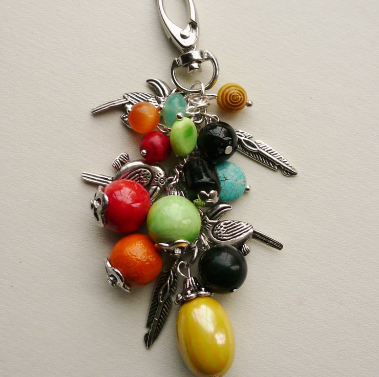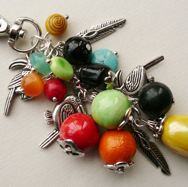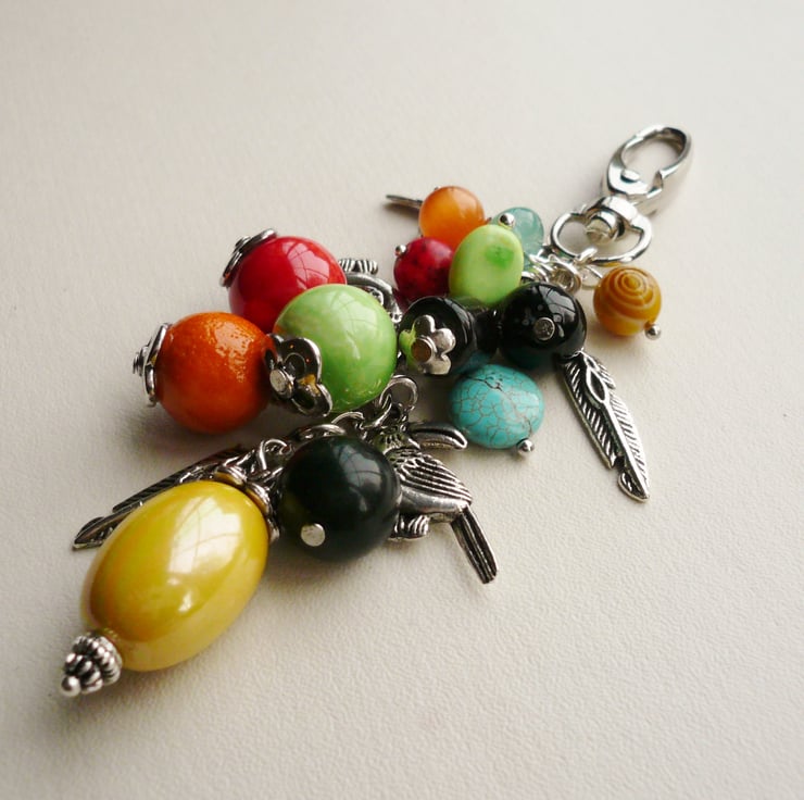 This lovely colourful handbag charm is made up of various 'toucan colours' of green, turquoise, orange, black and yellow beads in glass, resin, ceramic, obsidian and green magnesite in sizes ranging from 6mm to 20mm. Also includes Tibetan silver bead caps, spacer beads, feather and toucan charms. All attached to a silver plated chain and 35mm long trigger clasp.