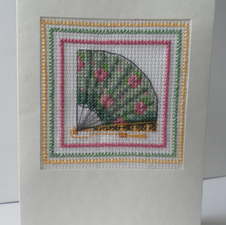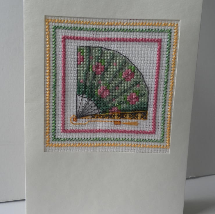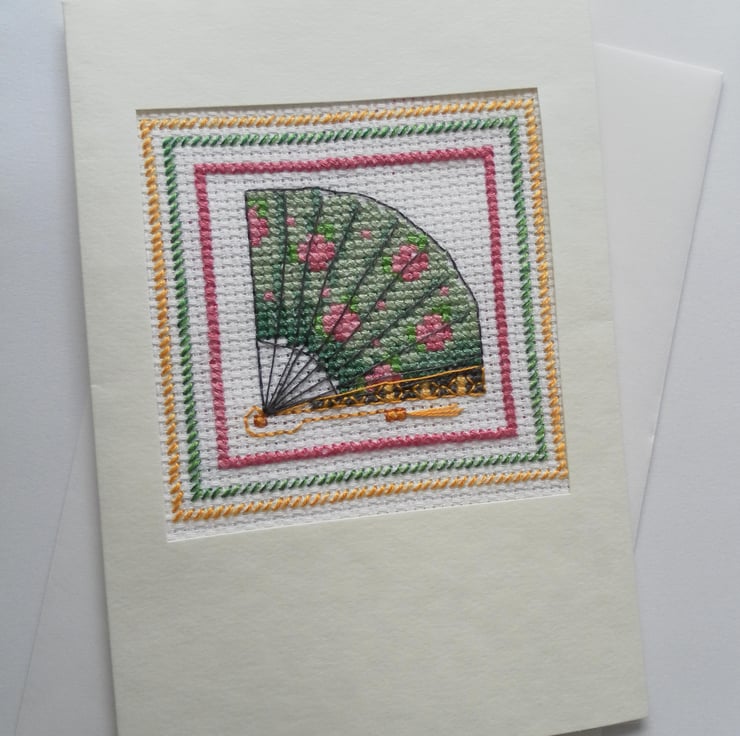 This delightful, multi-purpose, hand sewn, cross stitch card, features a very beautiful open fan, which is green with pink roses (not my original design). Card measures approximately 10cm x 15cm and is blank inside for your own message.