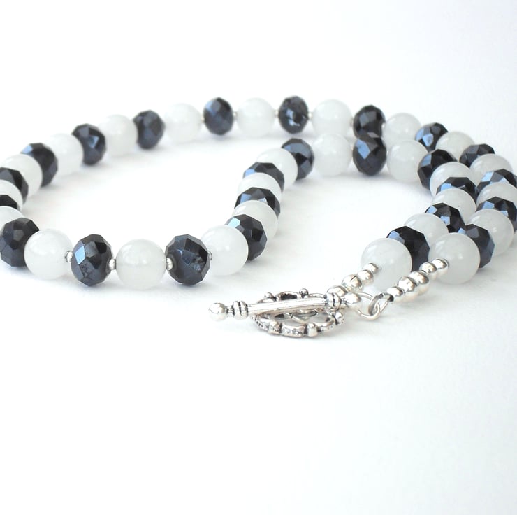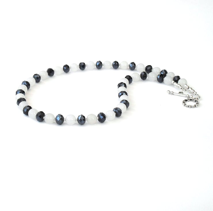A simple but elegant handmade necklace, using 8 mm semi-precious gemstone jade and jet black crystal rondelles.