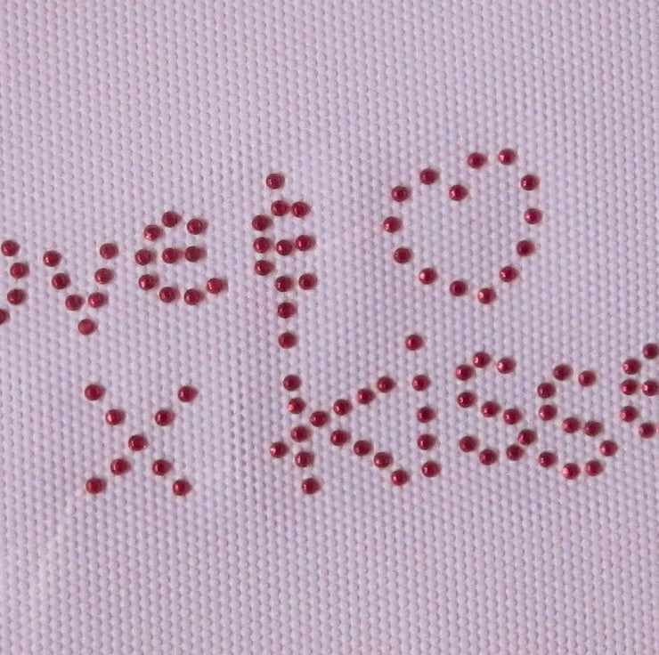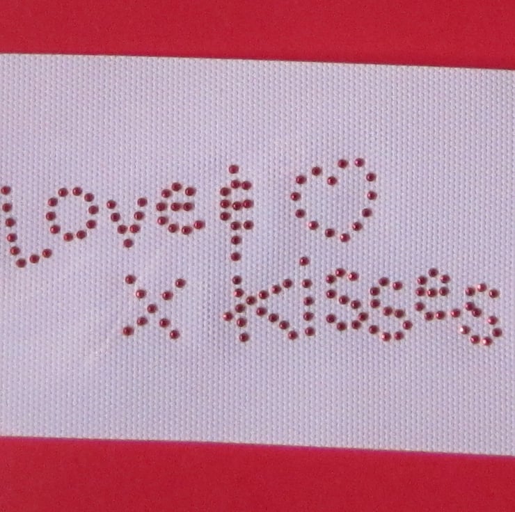 Iron on red sparkly stone Love & Kisses embellishment. Ideal for Valentines Day projects; it could be used on cards, clothing etc. Design measures 11 x 4.5 cm approx.
