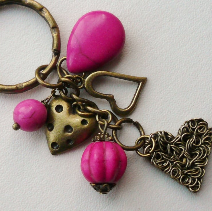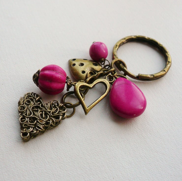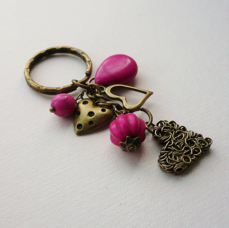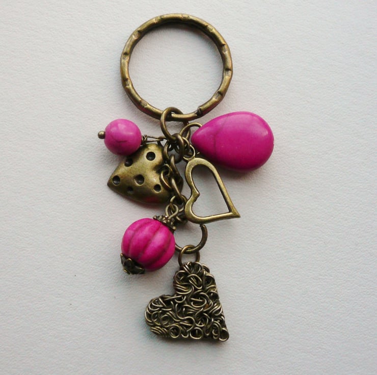 This key ring consists of three different antique bronze heart charms teamed with three different bright pink howlite beads. All attached to an antique bronze ring and chain.