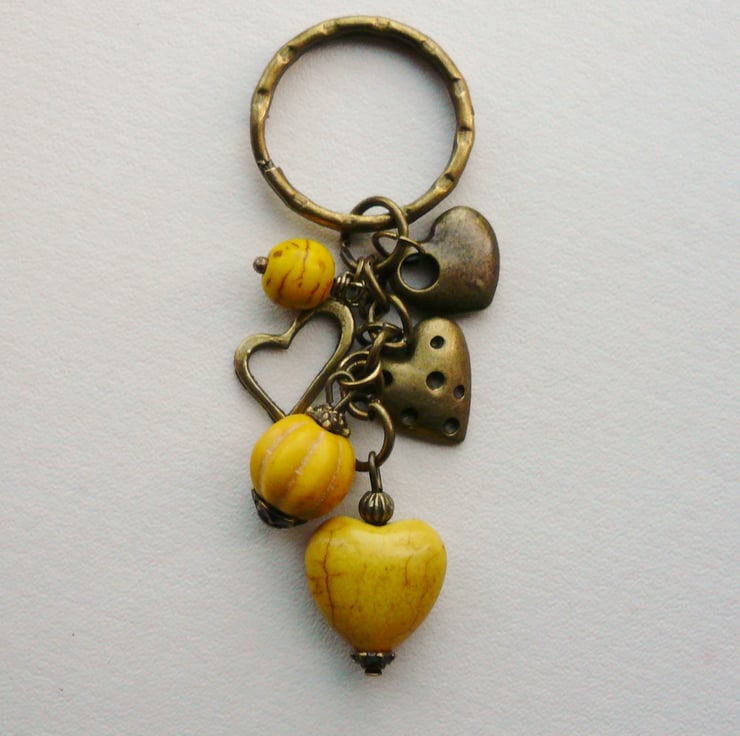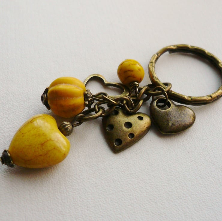 This key ring consists of three different antique bronze heart charms teamed with three different yellow howlite beads. All attached to an antique bronze ring and chain.