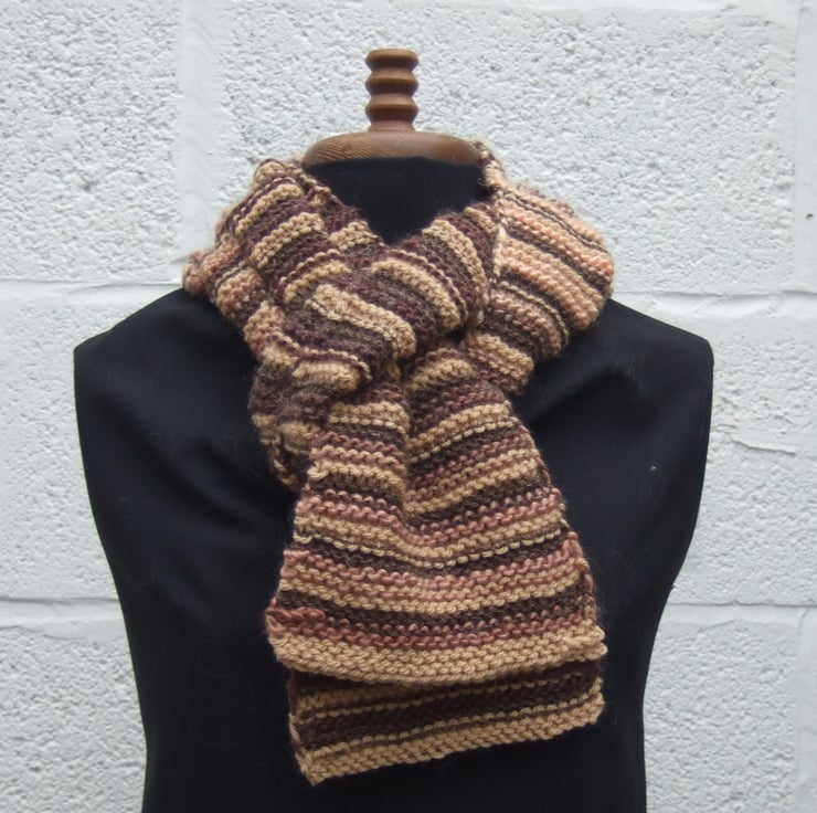 Stand out from the crowd with this one of a kind hand knit scarf. This cosy and warm scarf is the only one made in this colour combination, a stripy pattern with lovely textures and shades of browns.
