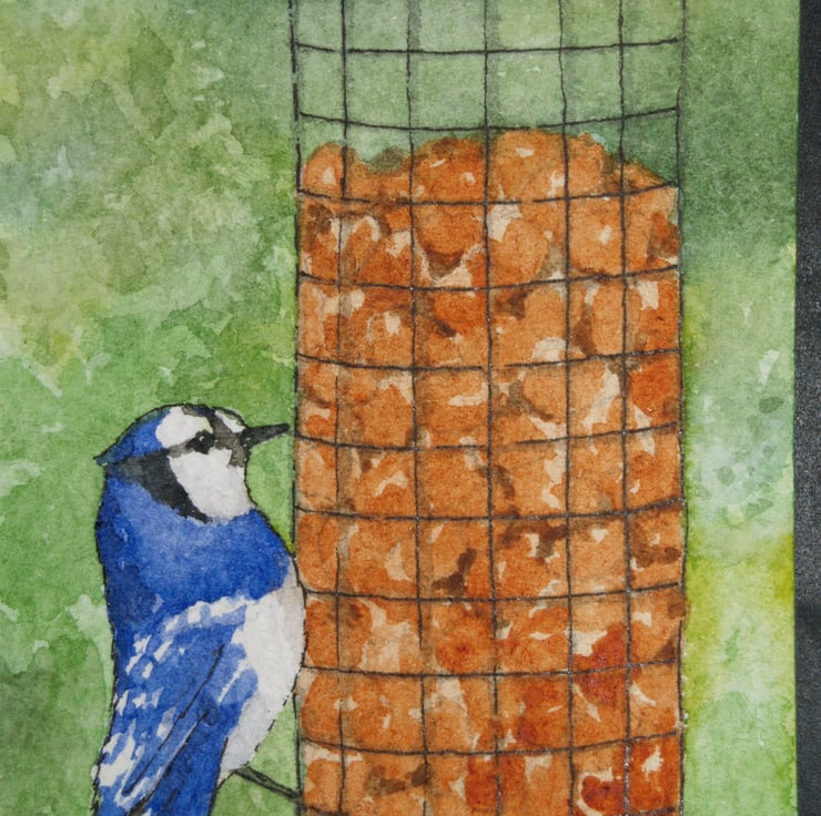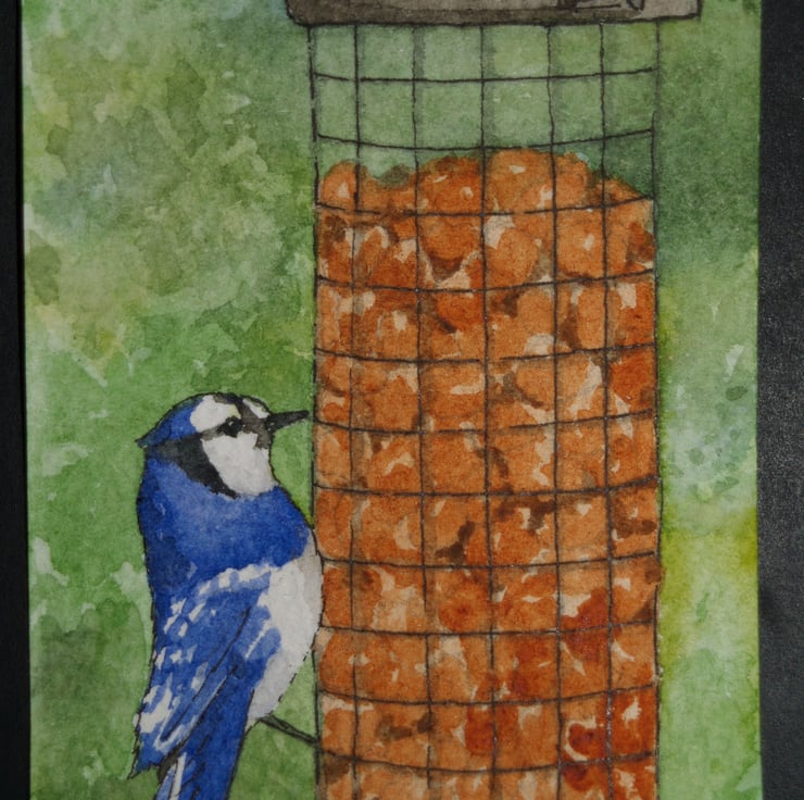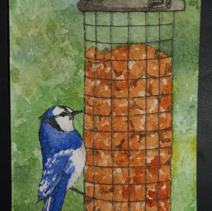 This ACEO is an original, handpainted watercolour of a Blue Jay pecking for nuts at a birdfeeder. It measures 2.5 x 3.5 inches (63 x 89mm). Because it is an original, it is completely unique and will make a good addition to any ACEO collection.