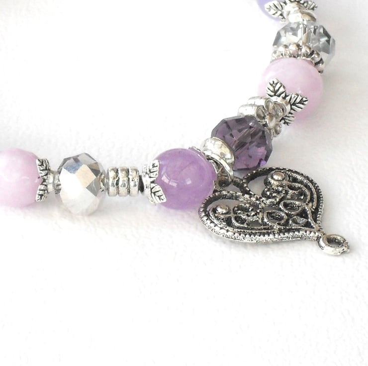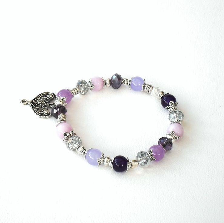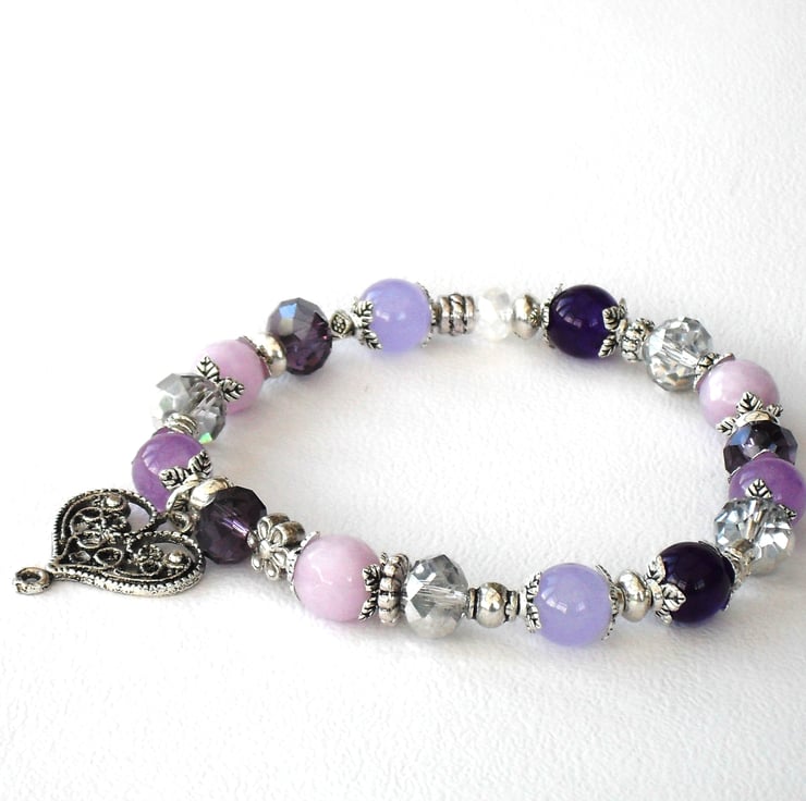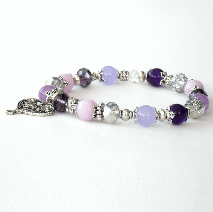 This gemstone bracelet is made with a mix of colours and stones - purple / lavender alexandrite and jade, silver & purple crystal and tibetan silver beads.