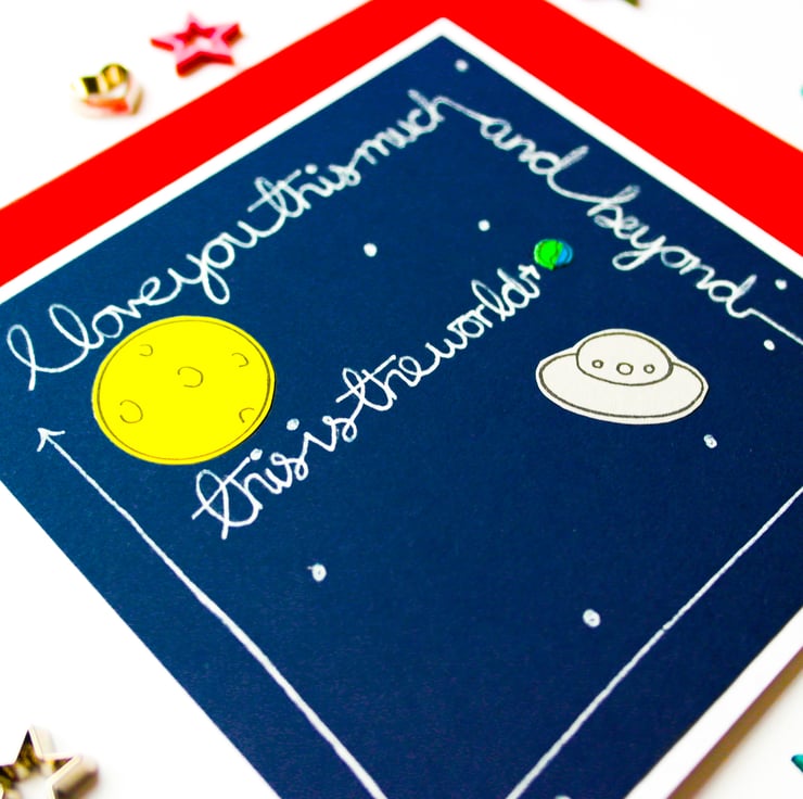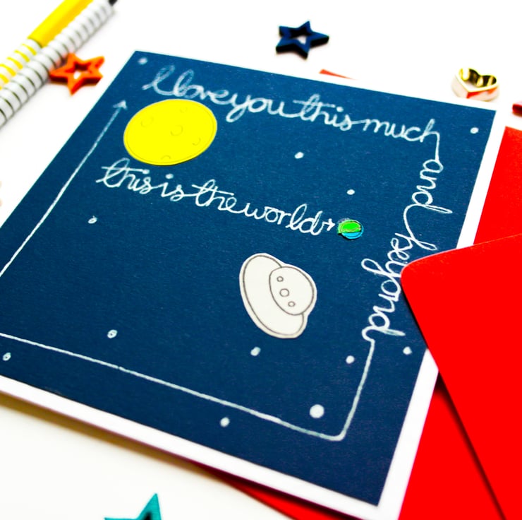 A handmade Valentine Card. I am sure we have all done that thing it when you say this is the world, this is the universe, well i have put it into card form. There is a small world, I have written it out and pointed an arrow to it, so its nice and easy to see. Around the edge is written the saying "I love you this much and beyond" Send it to your loved one on Valentine Day to show how much your care, why wait until Valentine's Day its a prefect Anniversary card, Birthday or a card just to show how much you love some one. . .