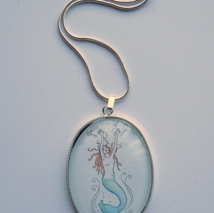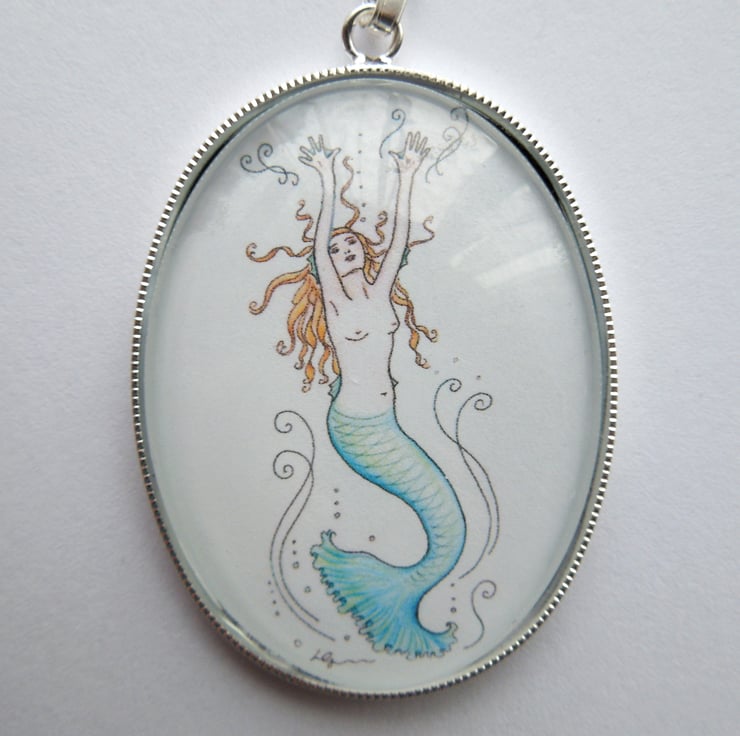 This is a handmade pendant featuring a miniature print of my own original artwork. Printed on quality paper and set behind glass into a silver-plated pendant frame, it depicts a mermaid underwater, flicking her turquoise tail.