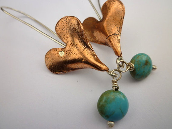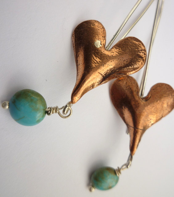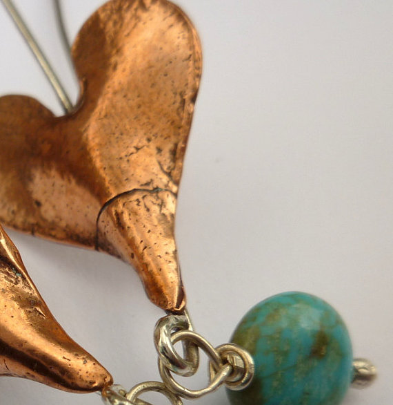 Copper heart earrings with silver earwires and turquoise finials.