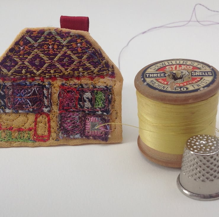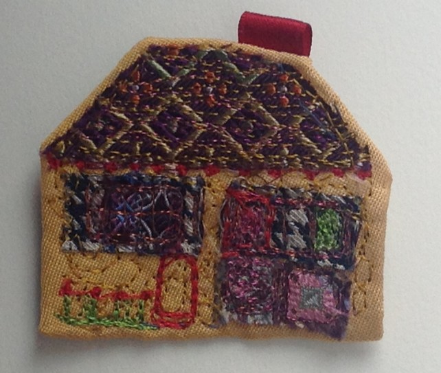 I have used tie silk remnants to create this unique textile brooch. Using applique and machine embroidery the brooch is lined on the reverse and has a brooch fastening. It measures approximately 6 x 6 cms. Each of my little house brooches have their own character and cannot be repeated exactly.