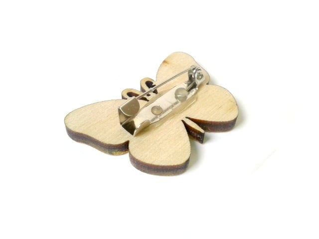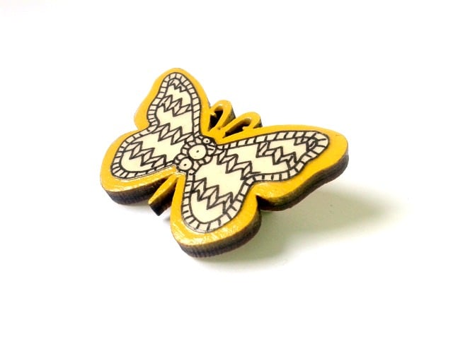 Made using wood and paper, this butterfly shaped wooden brooch features an illustrated pattern wing design. Painted in mustard yellow. Sealed with layers of varnish and a protective enamel finish.