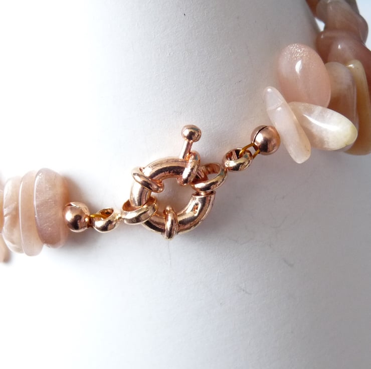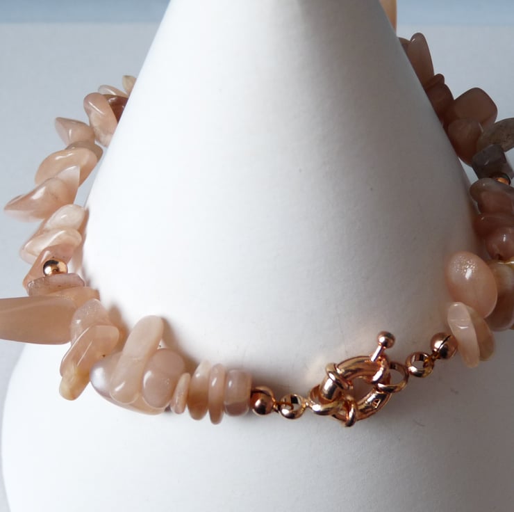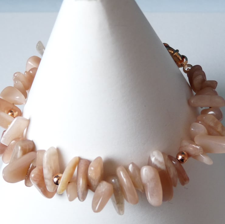 It is made with peach moonstone long nuggets and these have been threaded together with 3mm copper spacer beads, and then finished with a copper senorita clasp.