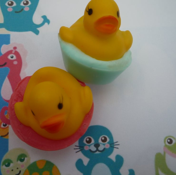 lovely rubber duck soaps, comes in pink and blue in various fragrances, goats milk soap set with a yellow rubber duck.