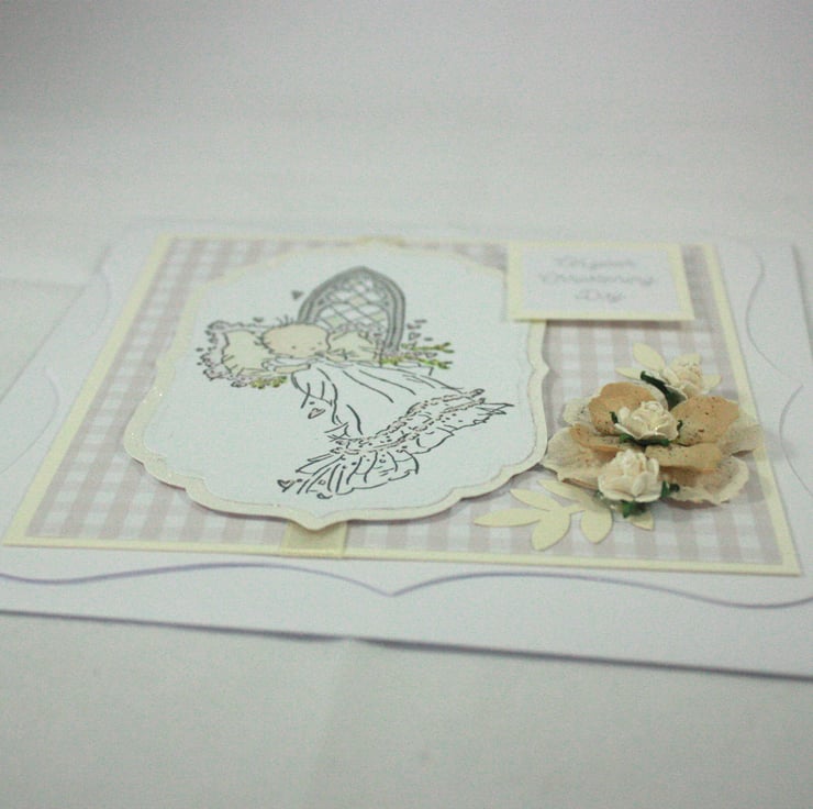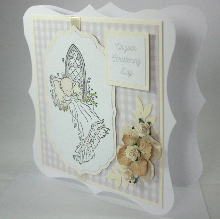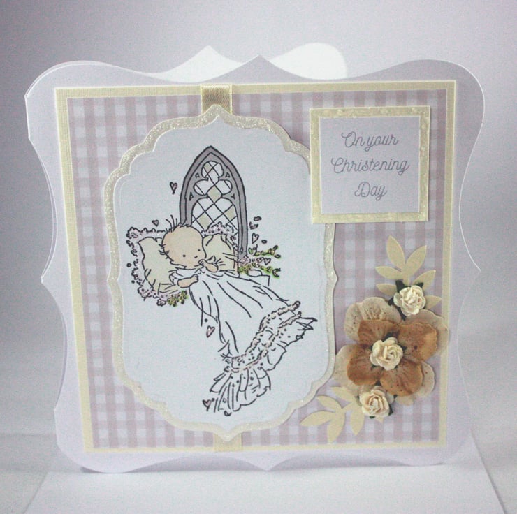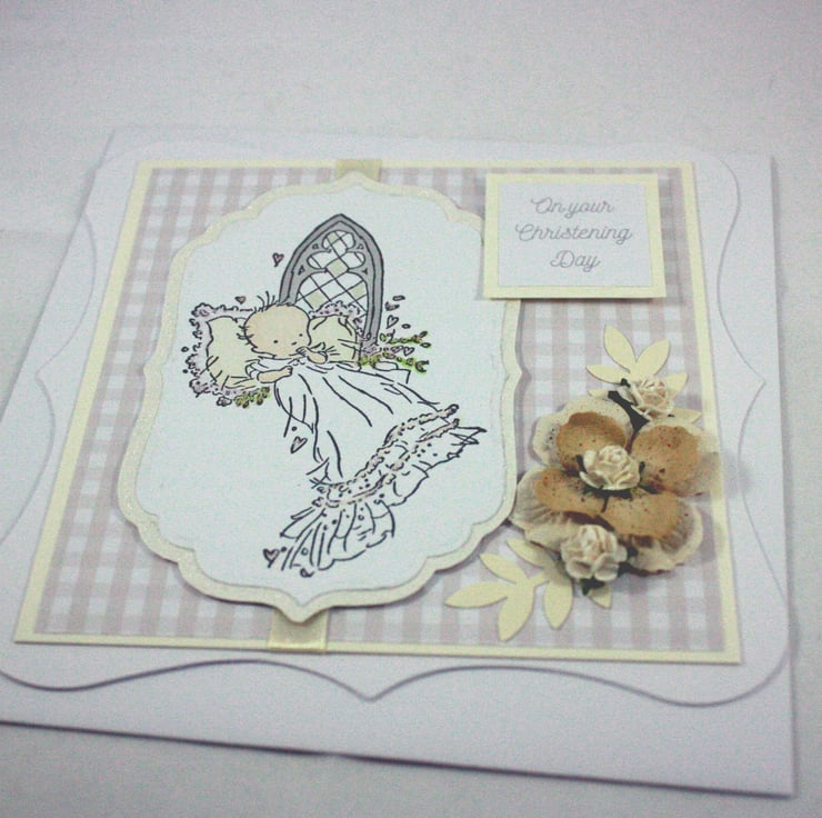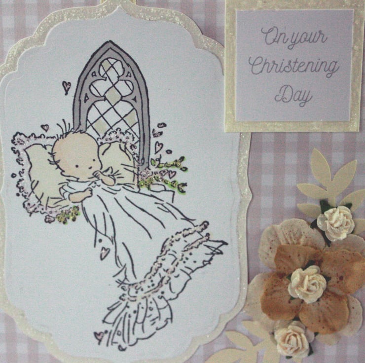 Shaped card approx 6" (15cm) square featuring a cute, hand stamped and coloured image of a baby. A printed message reads 'On your Christening Day' and the card is finished with paper flower embellishments.