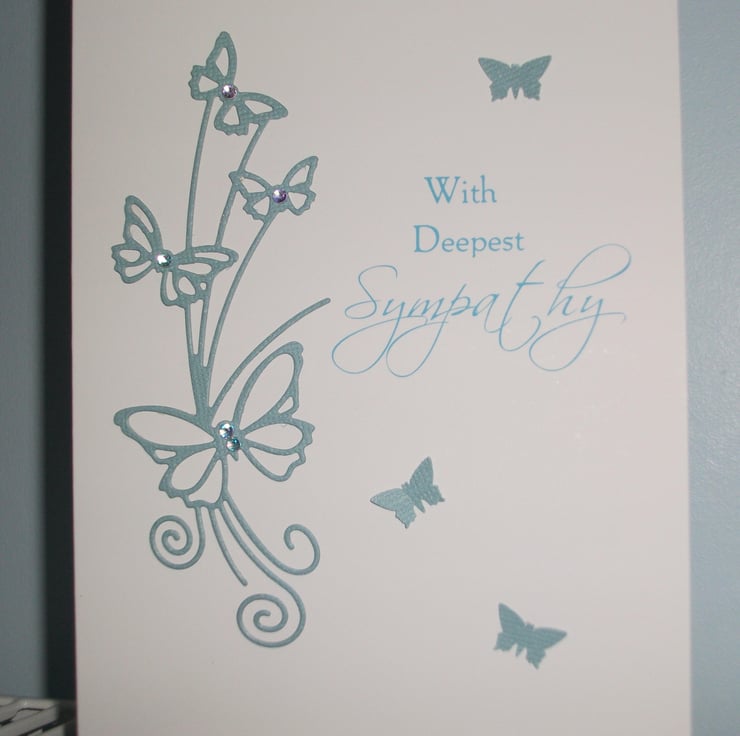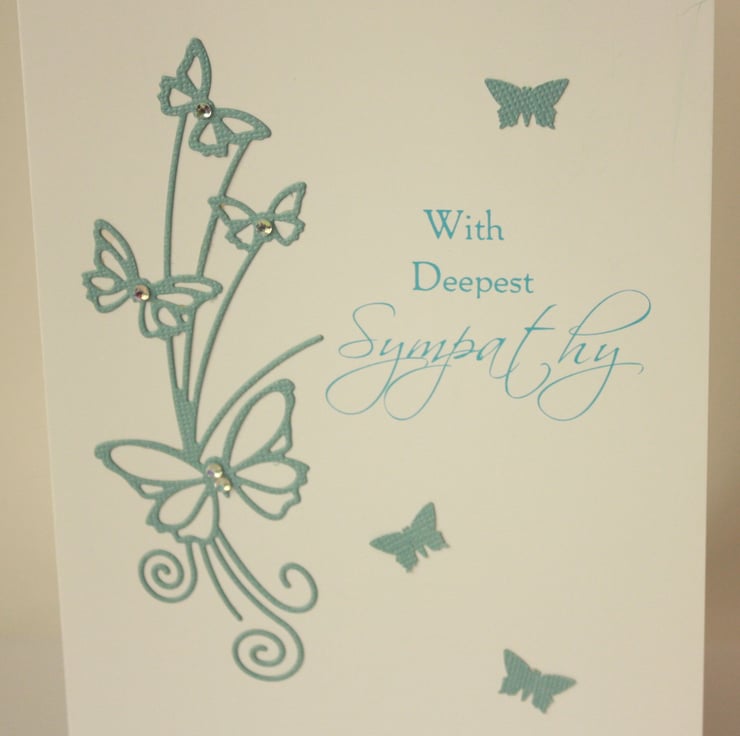 7" x 5" white sympathy card with message reading 'With Deepest Sympathy' and die cut butterflies with rhinestone embellishments. Inside is left blank for your own personal message of condolence.