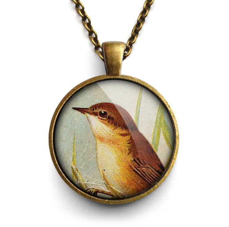 A gorgeous necklace featuring an image of a reed warbler taken from a vintage scrap. This design is part of 'The Birds' range.