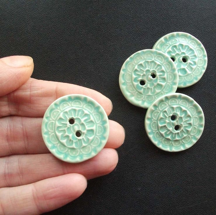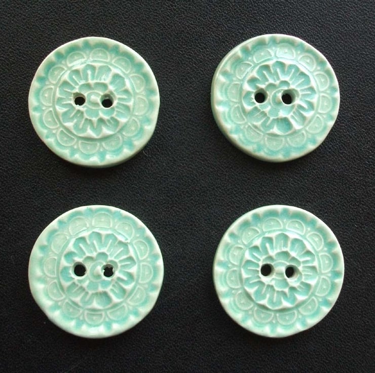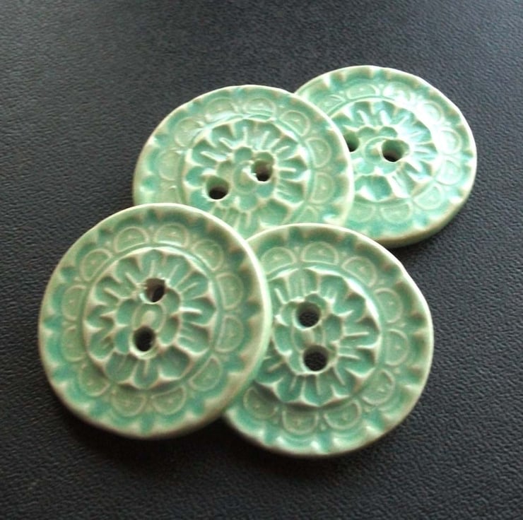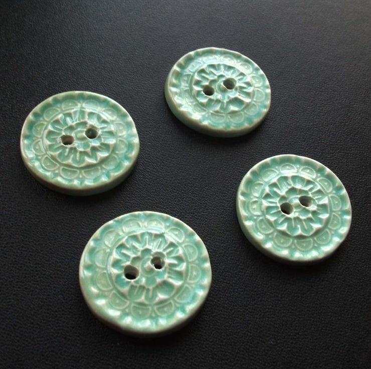 This set of four buttons are made from white earthenware clay, embossed and glazed to 1100 degrees, so nice and strong.