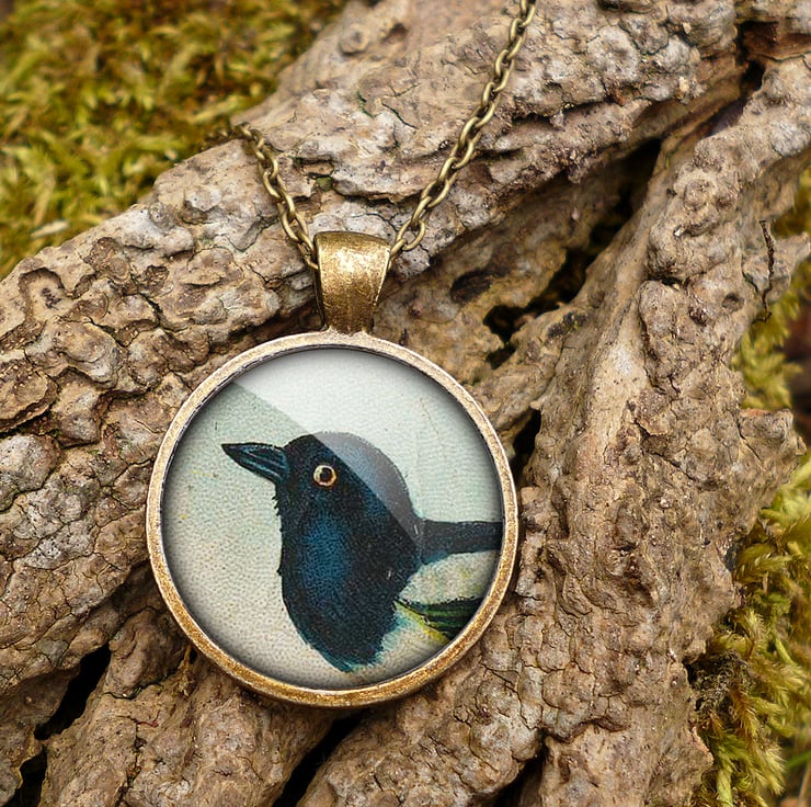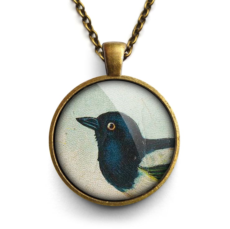 A gorgeous necklace featuring an image of a magpie taken from a vintage scrap. This design is part of 'The Birds' range.