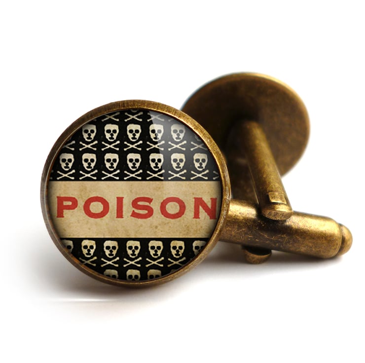 A beautiful pair of cufflinks featuring an image of a vintage poison warning. This design is part of the 'Dark Journey' range.