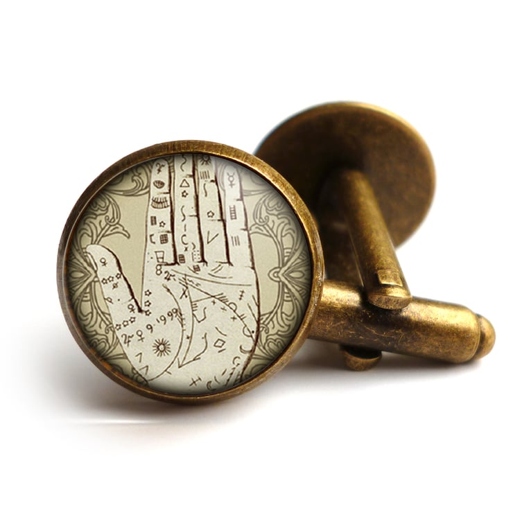A beautiful pair of cufflinks featuring a Victorian image of a palmistry hand. Palmistry is the art of foretelling a person's future by reading the palm of their hand. This design is part of the 'Dark Journey' range.